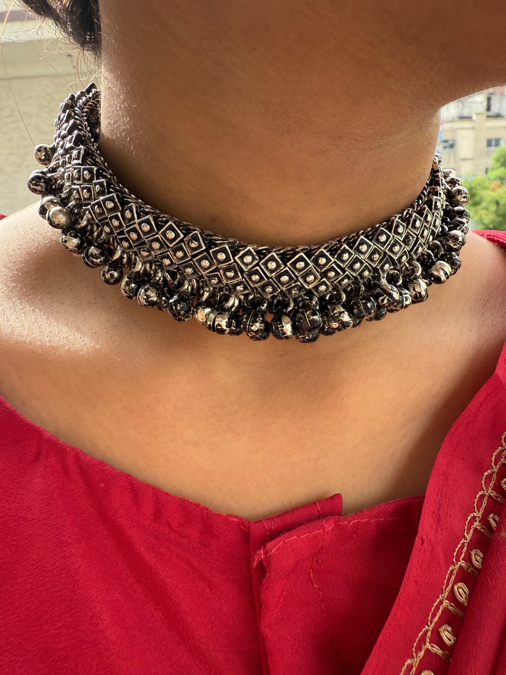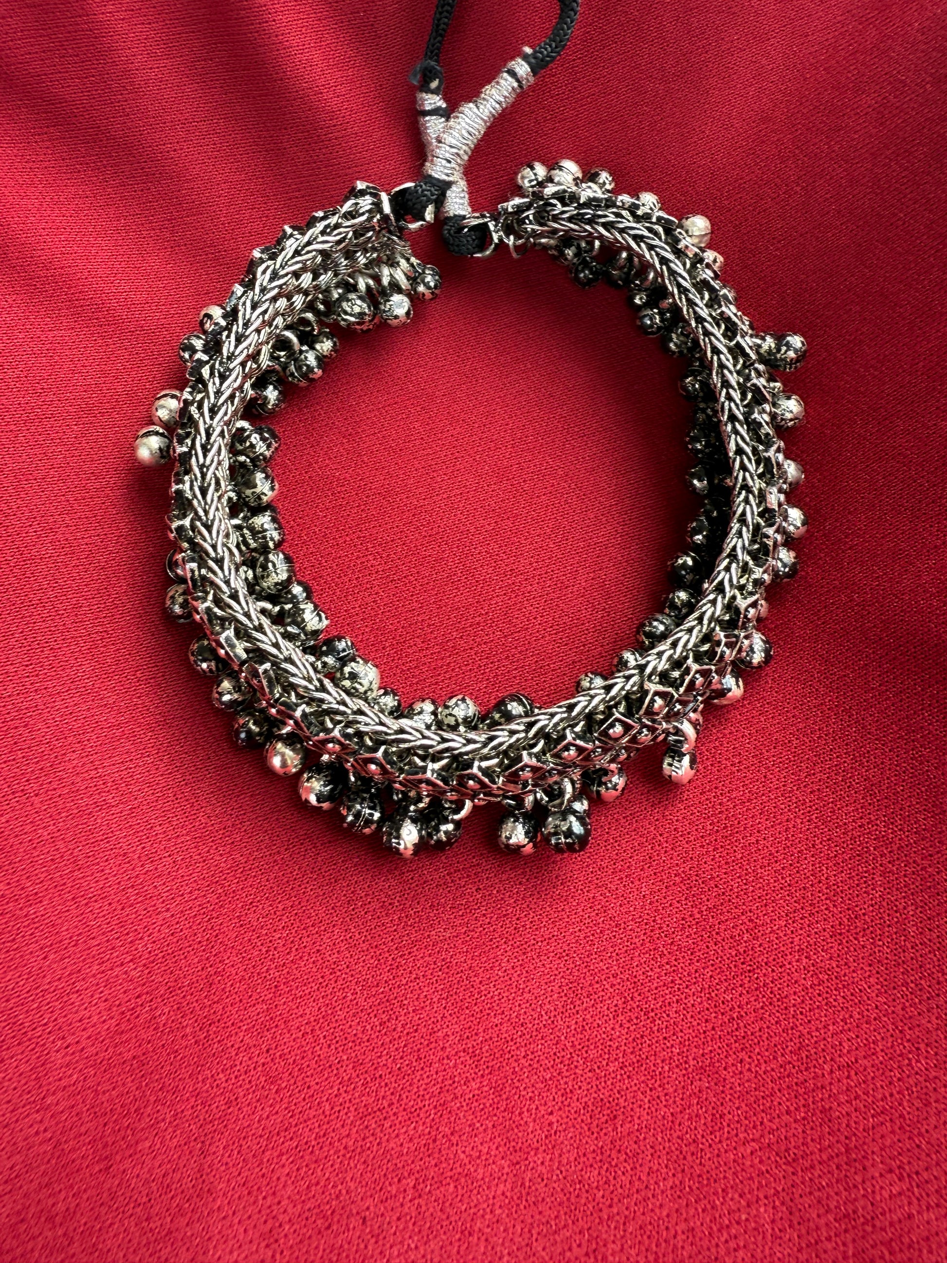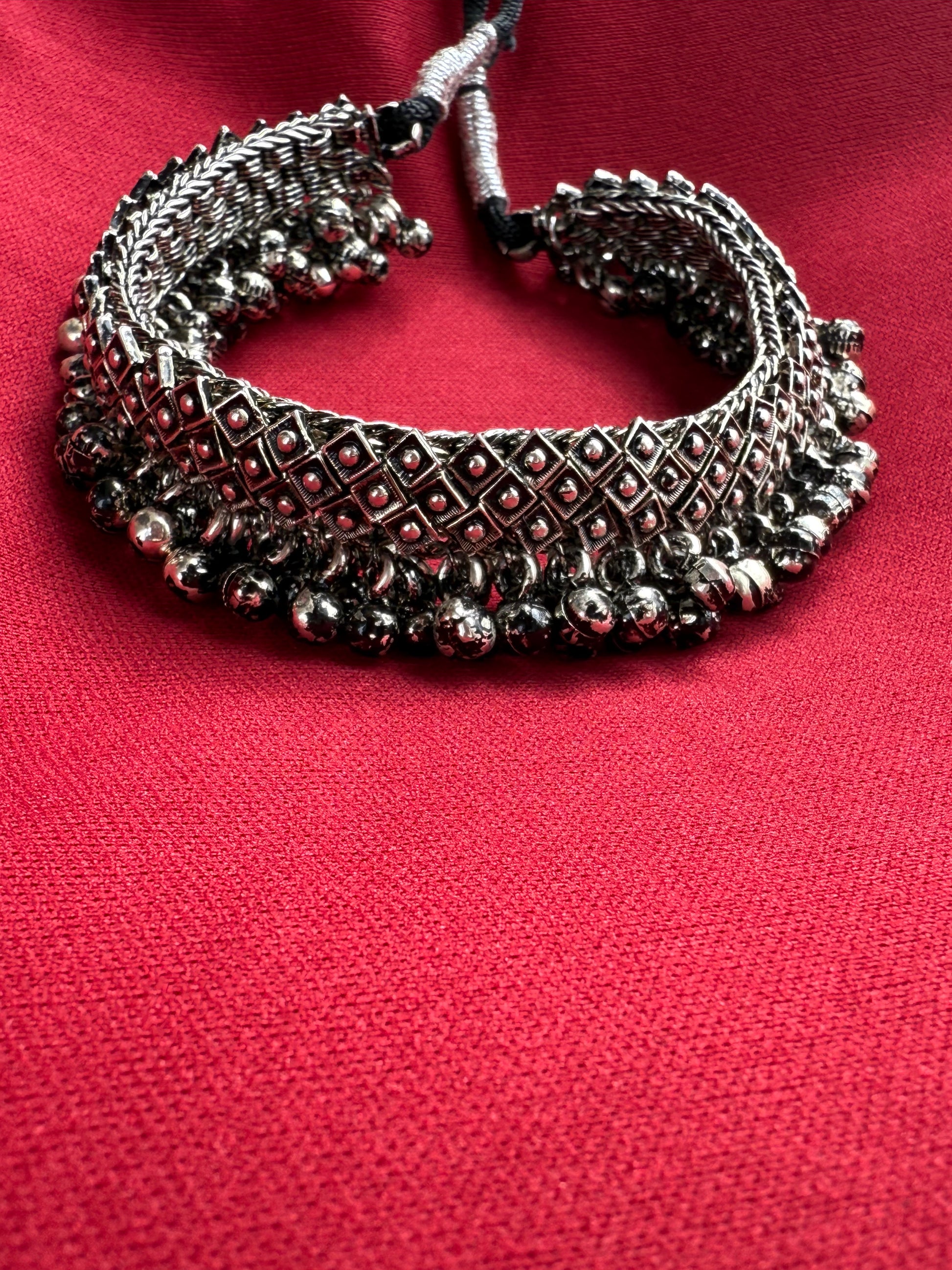 Turn heads with the timeless charm of our Ghungroo Choker Necklace – a perfect blend of ethnic grace and bold statement style. Handcrafted with care, this stunning piece features rows of delicate metal ghungroos strung on a sturdy adjustable thread, offering a snug fit that flatters every neckline.